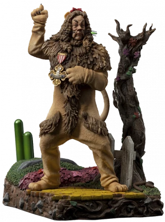 Auf dem gelben Ziegelsteinweg kommt ein Mädchen nachts an einem dunklen und unheimlichen Wald vorbei, wo es auf eine riesige Katzengestalt trifft, die aus der Dunkelheit springt. Wütend brüllend, um sie zu erschrecken, versteckt sie sich hinter einem großen Baum, aber ihr Haushund Toto bellt und knurrt das Ungeheuer an, das hinter ihm herjagt. Aus Angst um ihren kleinen Freund gibt sie der Raubkatze eine Ohrfeige und schimpft mit ihr. Zu ihrer Überraschung bricht das scheinbar wilde Tier zusammen und beginnt zu weinen und zu schluchzen. Mit eingezogenen Pfoten und verängstigtem Gesicht bringen Iron Studios die Statue ‘Cowardly Lion Deluxe – The Wizard of Oz – Art Scale 1/10’, mit dem anthropomorphen Löwen von Oz, der sogar Angst vor sich selbst hat, gespielt von Bert Lahr, mit seiner Tapferkeitsmedaille auf der Brust, über einem Sockel der schönen Landschaft seiner verzauberten Welt, neben einem Baum aus seinem Wald, mit den Türmen der Smaragdstadt im Hintergrund und der gelben Ziegelstraße zu seinen Füßen. Er schließt sich dann dem Mädchen Dorothy und ihren Freunden auf der Suche nach dem geheimnisvollen Zauberer an, damit der Löwe den Zauberer bitten kann, ihn mutig zu machen.
