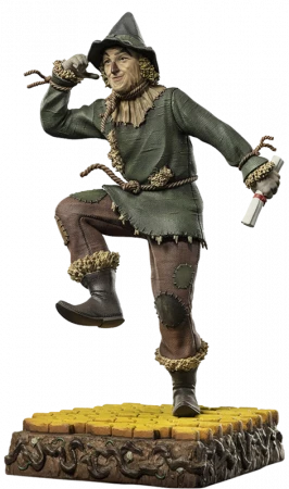 In einem Maisfeld entlang der gelben Ziegelsteinstraße kommt das hübsche Mädchen aus Kansas, Dorothy, an eine große Kreuzung und, verwirrt darüber, welchem Weg sie folgen soll, findet sie in der Nähe eine neugierige sprechende Gestalt, die die Krähen verscheucht. Unglücklich darüber, dass er seine Aufgabe, die Vögel zu verscheuchen, nicht erfüllen konnte, bestand seine größte Unzufriedenheit darin, kein Gehirn zu haben. Das Mädchen erzählt ihm von ihrer Suche nach dem Zauberer, der ihr helfen könnte, wieder nach Hause zu kommen, und die ausgestopfte Figur schließt sich ihrer Reise an, in der Hoffnung, dass der Zauberer ihm das ersehnte Gehirn geben kann. Mit einem Finger auf dem Kopf und dem Diplom, das seine Intelligenz beweist, in einer seiner Hände, bringen Iron Studios die Statue ‘Scarecrow – The Wizard of Oz – Art Scale 1/10’, mit der verängstigten Katze und dem weisen Charakter über einer einfachen Basis der Yellow Brick Road.