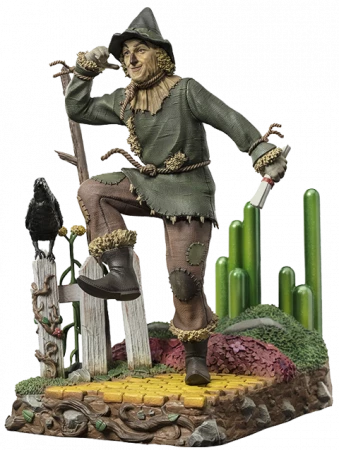 In einem Maisfeld entlang der gelben Ziegelsteinstraße kommt das hübsche Mädchen aus Kansas, Dorothy, an eine große Kreuzung und, verwirrt darüber, welchem Weg sie folgen soll, findet sie in der Nähe eine neugierige sprechende Gestalt, die die Krähen verscheucht. Unglücklich darüber, dass er seine Aufgabe, die Vögel zu verscheuchen, nicht erfüllen konnte, bestand seine größte Unzufriedenheit darin, kein Gehirn zu haben. Das Mädchen erzählt ihm von ihrer Suche nach dem Zauberer, der ihr helfen könnte, wieder nach Hause zu kommen, und die ausgestopfte Figur schließt sich ihrer Reise an, in der Hoffnung, dass der Zauberer ihm das ersehnte Gehirn geben kann. Mit einem Finger auf dem Kopf und dem Diplom, das seine Intelligenz beweist, in einer seiner Hände, bringen Iron Studios die Statue ‘Scarecrow Deluxe – The Wizard of Oz – Art Scale 1/10’, auf einem Sockel, der mit Details aus dem schönen Land Oz gefüllt ist, mit der Smaragdstadt im Hintergrund, der gelben Ziegelsteinstraße und der Vogelscheuche, gespielt von Ray Bolger, neben dem Maisfeldpfosten und dem Zaun mit einer der Krähen, die er vergeblich zu erschrecken versucht.